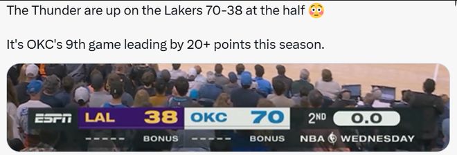 第三,雷霆半场以70-38领先湖人,这是雷霆本赛季第九次半场领先对手20+分的表现。